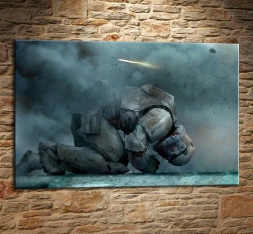Découvre dans ce Cadre Star Wars un soldat Stormtrooper gisant par terre entrain de se vider de son sang aprÚs une bataille difficile contre les forces de la résistance.