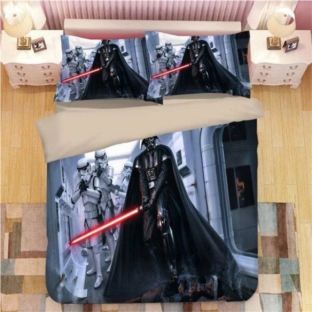 Découvre sans plus attendre La Housse de Couette Star Wars pour un lit 2 places, cette couverture est décorée avec une photo de Dark Vador et de ses hommes dans une vaisseau de l’empire.