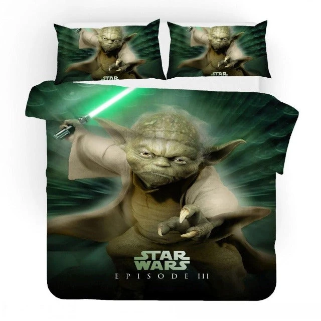 Retrouve sur cette Couette Star Wars ton chevalier jedi préféré, le jedi qui dirigait le haut conseil jedi avant l’avènement de l’empire galactique, évidemment je fais allusion à Yoda.