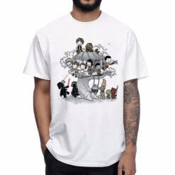 Retrouve dans ce T Shirt Star Wars le Drôle une reprise d’une des scènes de star wars mais dessiner de façon à être aimée par les enfants.