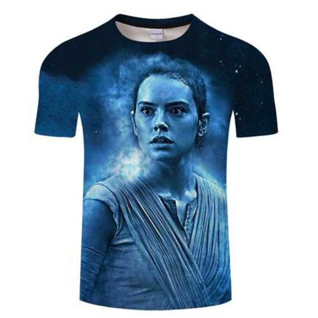 Retrouve la nouvelle star de la derniere trilogie Star Wars j’ai nommé Rey sur ce Tee Shirt superbement dessiné avec des couleurs bleus .