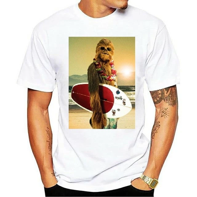 Sur ce T Shirt, le personnage de Star Wars Chewbacca se détend à la plage avec une planche de surf rouge dans la main et un collier hawaien.