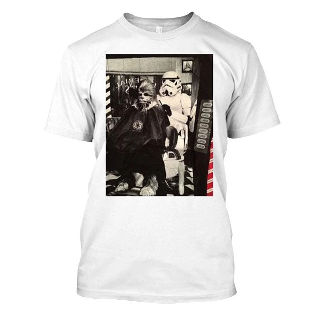 Chez Jedi Shop tu auras tout vu et pour cause, découvre ce magnifique T Shirt Chewbacca entrain de se faire couper les cheveux par un stormtrooper.