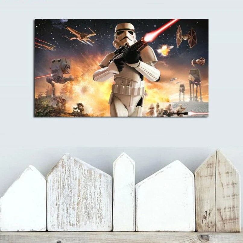 Dans cette Toile Star Wars tu va découvrir une scène lumineuse d’un soldat de l’empire avec son armée derère entrain d’initier une attaque.