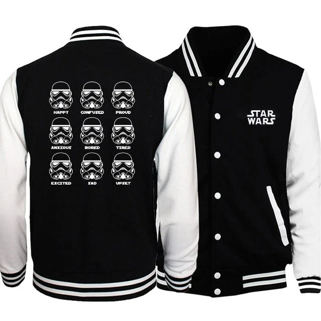 Découvre cette veste Américaine de Baseball et décrit en 9 image les émotions que peut ressentir un soldat Stormtrooper (bien sûr c’est ironique)